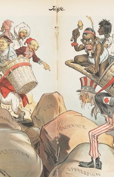 The editorial cartoon "'The White Man's Burden' (Apologies to Rudyard Kipling)" shows John Bull (Britain) and Uncle Sam (U.S.) delivering the world's people of colour to civilisation (Victor Gillam, Judge magazine, 1 April 1899). The people in the basket carried by Uncle Sam are labelled Cuba, Hawaii, Samoa, "Porto Rico", and the Philippines, while the people in the basket carried by John Bull are labelled Zulu, China, India, "Soudan", and Egypt.
